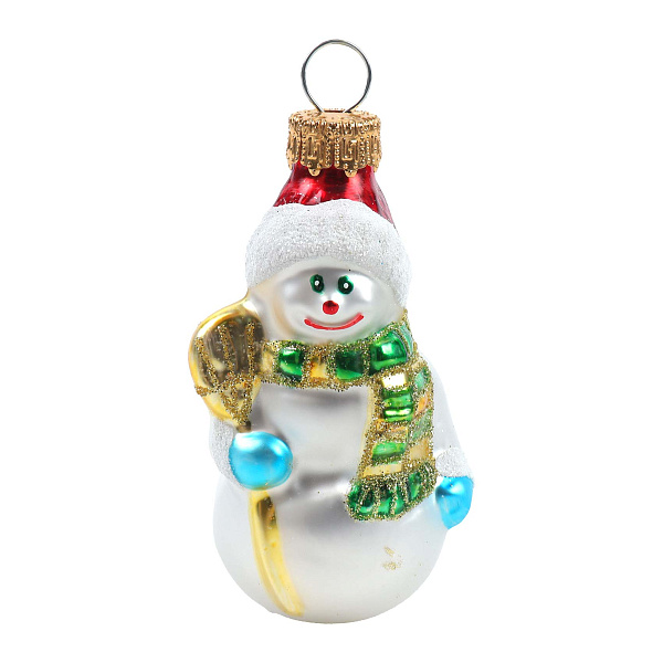 Елочное украшение Снеговик в красном колпаке и шарфом белый стеклянный 8,5см