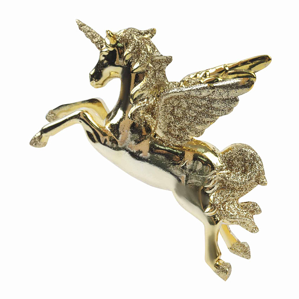 Елочное украшение в виде аликорна – крылатого единорога – выполнено в золоте с глянцевым блеском и декором в стиле лофт. Высота украшения составляет 10 см, что делает его ярким акцентом на новогодней ёлке. Изделие оформлено с вниманием к деталям: золотистое покрытие и сверкающие крылья придают ему благородный и праздничный вид.