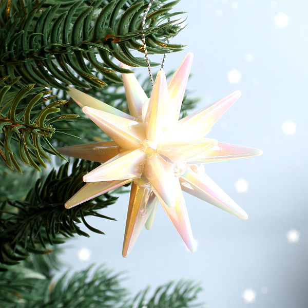 Елочная игрушка в виде объемной звезды выполнена в современном стиле лофт. Она отличается глянцевой перламутровой поверхностью, которая переливается на свету, добавляя праздничного настроения. Белоснежный цвет звезды прекрасно сочетается с хвойными ветками, создавая изящный контраст. Диаметр изделия составляет 7,5 см, что делает его заметным акцентом на новогоднем дереве.