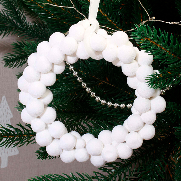 Декоративный венок выполнен в стиле хюгге из пластика с матовым белым покрытием. Венок состоит из множества небольших бархатистых шариков, собранных в плотное кольцо диаметром 12 см. Такая текстура придает изделию уютный и теплый внешний вид. Венок оснащен лентой для удобного подвешивания, что позволяет использовать его в качестве украшения для интерьера или праздничного декора.