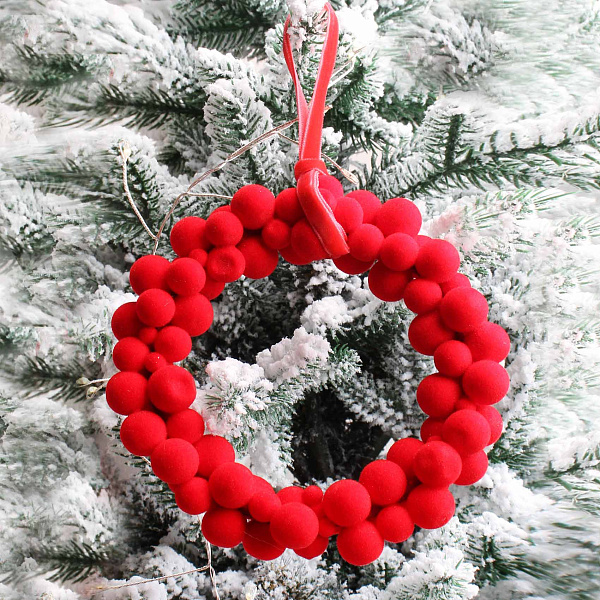 Декоративный венок выполнен в стиле хюгге из пластика с матовым красным покрытием. Венок состоит из множества небольших бархатистых шариков, собранных в плотное кольцо диаметром 12 см. Такая текстура придает изделию уютный и теплый внешний вид. Венок оснащен лентой для удобного подвешивания, что позволяет использовать его в качестве украшения для интерьера или праздничного декора.