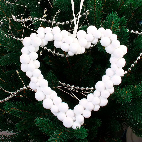Декоративный венок в форме сердца выполнен в стиле хюгге — нежное и уютное украшение, идеально подходящее для создания теплой атмосферы в интерьере. Изготовлен из пластика и покрыт матовым белым покрытием с бархатистой текстурой, имитирующей мягкие бусины различного диаметра. Размер венка составляет 12 см, что позволяет использовать его как самостоятельный элемент декора или дополнение к праздничным композициям.