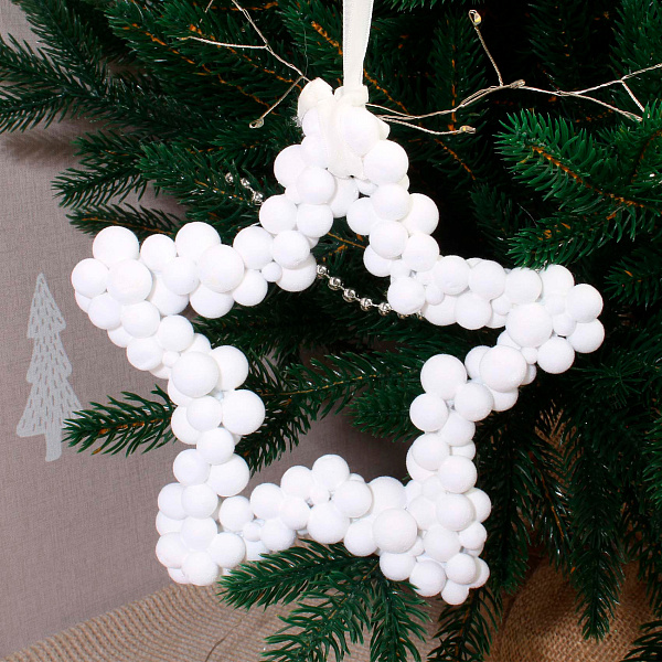 Декоративный венок в форме звезды выполнен в стиле хюгге — нежное и уютное украшение, идеально подходящее для создания теплой атмосферы в интерьере. Изготовлен из пластика и покрыт матовым белым покрытием с бархатистой текстурой, имитирующей мягкие бусины различного диаметра. Размер венка составляет 15 см, что позволяет использовать его как самостоятельный элемент декора или дополнение к праздничным композициям.