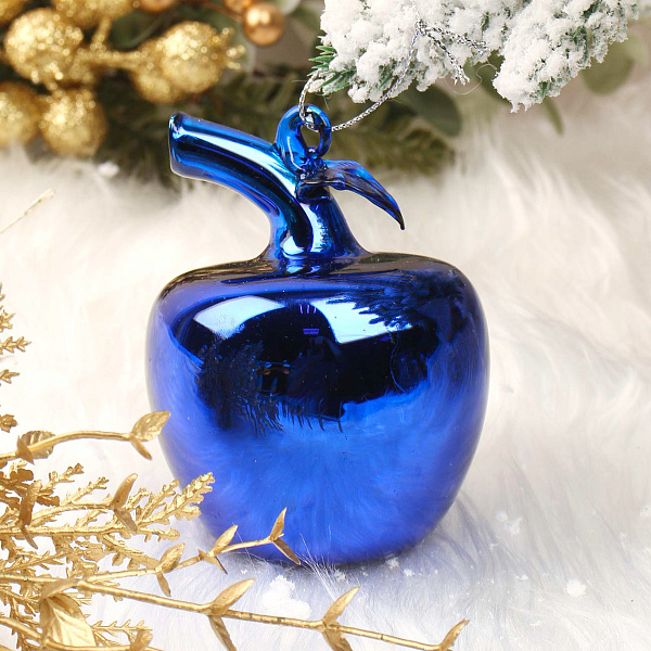 Елочное украшение в виде яблока выполнено из стекла и окрашено в насыщенный синий цвет. Украшение имеет гладкую блестящую поверхность, что придает ему выразительный вид. Фигурка относится к коллекции «Лофт» и подвешивается за тонкую серебристую нить, что позволяет легко разместить ее на новогодней елке.