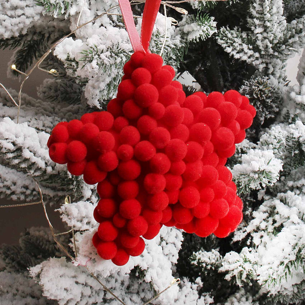 Елочная игрушка в виде звезды выполнена из пластика с матовым покрытием в красном цвете, оформленная в стиле хюгге — уют и тепло. Игрушка покрыта небольшими бархатистыми шариками, придающими ей интересную фактуру и мягкий визуальный эффект. Высота изделия составляет 8 см, что делает ее удобной для подвешивания на елку или использование в других праздничных декорациях. Игрушка оснащена ленточкой для легкого и надежного крепления.