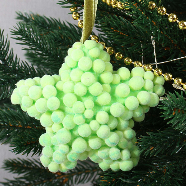 Елочная игрушка в форме звезды выполнена в ярком зеленом цвете и украшена небольшими шариками из текстиля с бархатистой поверхностью. Изделие имеет размер 8 см и легкий вес. Игрушка крепится на велюровую ленту, которая позволяет подвешивать украшение не только на елку, но и на двери, стены или окна.