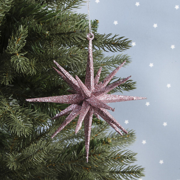 Многогранная елочная звезда выполнена из пластика розового цвета и обладает размером 15 см. Изделие выполнено со сложной геометрией, что придает украшению уникальный объем и выразительность. Розовое покрытие со сверкающими элементами создает эффект мерцания, добавляя праздничного блеска в атмосферу.