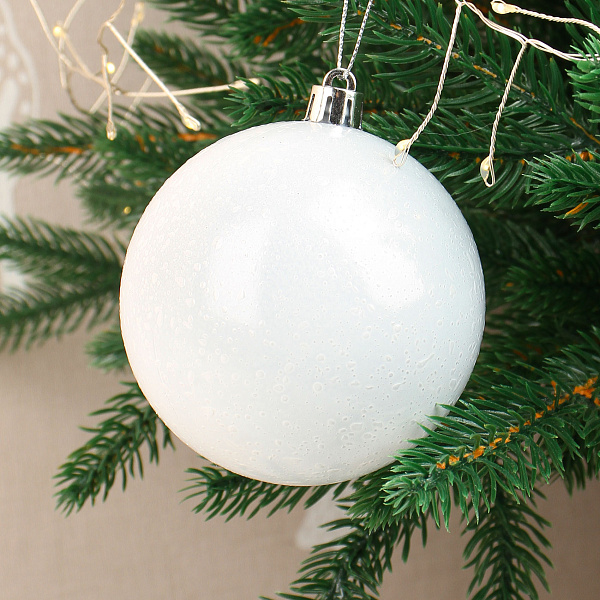 Новогоднее елочное украшение в винтажном стиле — белый шар диаметром 8 см, выполненный из пластика с эффектом «дождь». Поверхность украшена рельефными каплями, имитирующими конденсат, что придает шару оригинальный и нарядный вид. Изящное и универсальное изделие прекрасно дополнит праздничный декор любого интерьера. Оснащено серебристым шнурком для удобного подвешивания на елку.