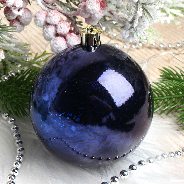 Винтажное елочное украшение в форме белого шара, выполненное из пластика с синим покрытием с эффектом старения. Диаметр шара составляет 8 см. Изделие отличается состаренным металлическим блеском с текстурными пятнами, придающими украшению атмосферу утонченности и ностальгии. Украшение оснащено подвеской для удобного крепления на новогодней елке, создавая изящный винтажный акцент в праздничном интерьере.