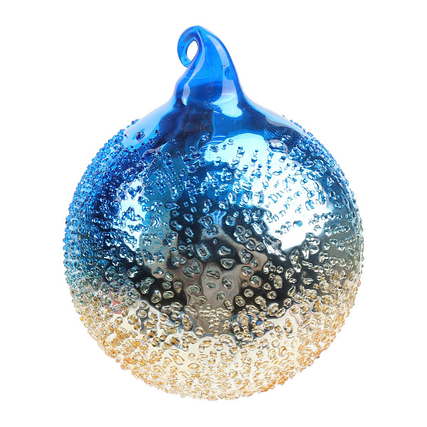 Украшение представляет собой елочный шар в стиле лофт, выполненный из стекла насыщенного синего цвета с переходом в желтый. Диаметром 8 см, шар украшен рельефной текстурой, имитирующей капли воды, что придает изделию эффектную и оригинальную фактуру. Глянцевая поверхность дополняется мелкими бусинами, создавая необычную игру света и отражений. На верхней части украшения предусмотрено удобное крепление в виде петельки с золотистой ниткой для подвешивания на елку или другие праздничные композиции.
