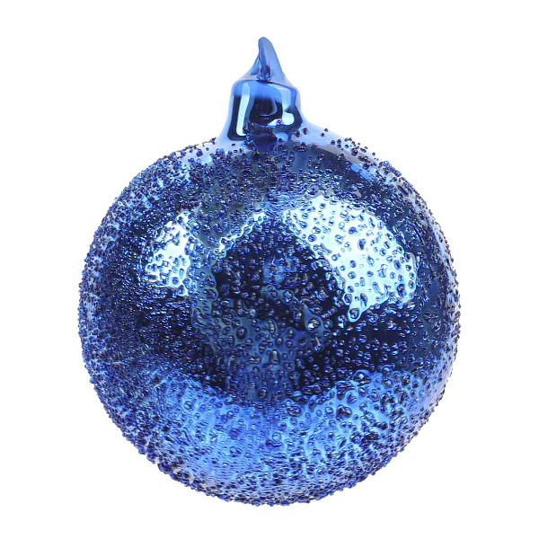 Украшение представляет собой елочный шар в стиле лофт, выполненный из стекла насыщенного синего цвета. Диаметром 10 см, шар украшен рельефной текстурой, имитирующей капли воды, что придает изделию эффектную и оригинальную фактуру. Глянцевая поверхность дополняется мелкими бусинами, создавая необычную игру света и отражений. На верхней части украшения предусмотрено удобное крепление в виде петельки с золотистой ниткой для подвешивания на елку или другие праздничные композиции.