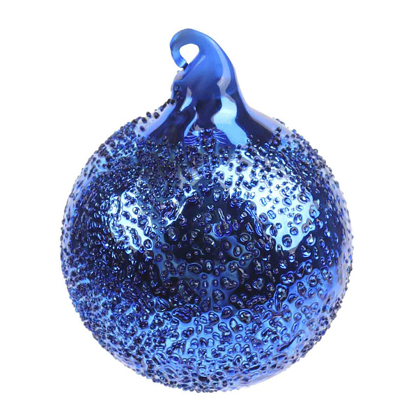 Украшение представляет собой елочный шар в стиле лофт, выполненный из стекла насыщенного синего цвета. Диаметром 8 см, шар украшен рельефной текстурой, имитирующей капли воды, что придает изделию эффектную и оригинальную фактуру. Глянцевая поверхность дополняется мелкими бусинами, создавая необычную игру света и отражений. На верхней части украшения предусмотрено удобное крепление в виде петельки с золотистой ниткой для подвешивания на елку или другие праздничные композиции.