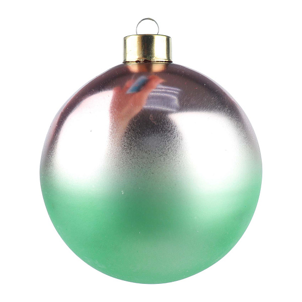 Ёлочное украшение в форме классического шара с изящным градиентным переходом от нежно-розового к мятному оттенку — элегантный элемент декора в стиле лофт. Изготовлено из стекла с матовой поверхностью, которая придаёт изделию мягкость и утончённость, создавая нежное сияние бликов.