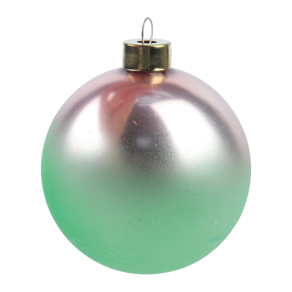Ёлочное украшение в форме классического шара с изящным градиентным переходом от нежно-розового к мятному оттенку — элегантный элемент декора в стиле лофт. Изготовлено из стекла с матовой поверхностью, которая придаёт изделию мягкость и утончённость, создавая нежное сияние бликов.