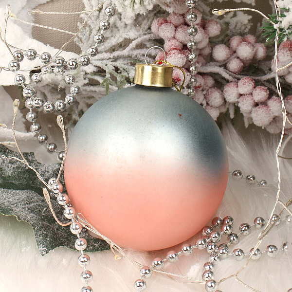 Ёлочное украшение в форме классического шара с изящным градиентным переходом от нежно-голубого к пудровому оттенку — элегантный элемент декора в стиле лофт. Изготовлено из стекла с матовой поверхностью, которая придаёт изделию мягкость и утончённость, создавая нежное сияние без бликов.