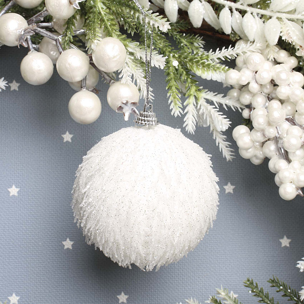 Елочный шар «Оттепель» белого цвета станет стильным акцентом в праздничном декоре. Его поверхность напоминает свежий снег, создавая эффект нежности и тепла. Необычная текстура шара придает уют и одновременно изысканность новогодней елке.