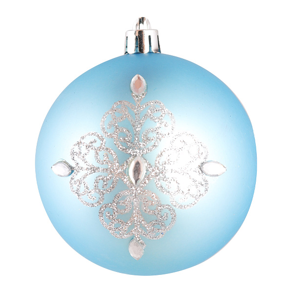 Елочный шар в голубом цвете — это изысканное украшение для праздничного декора. Диаметр шара составляет 8 см. Он изготовлен из пластика, что обеспечивает его прочность и легкость. Поверхность украшения декорирована изящным узором в виде звезды с блестящими акцентами.
