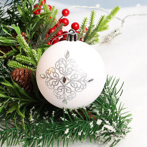 Елочный шар выполнен в классическом белом цвете. На поверхности изображен изысканный узор в форме звезды, дополняющий праздничный декор.