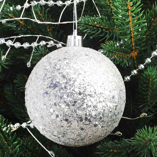 Новогоднее елочное украшение в форме шара, выполненное из пластика с серебристым блестящим покрытием. Диаметр шара составляет 8 см. Поверхность украшения покрыта мелкими сверкающими блестками, создавая эффект ослепительного сияния и праздничного настроения. Изделие оснащено подвеской для удобного крепления на новогоднюю елку. Идеально подходит для создания яркого и элегантного декора в праздничном интерьере.