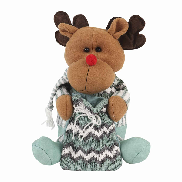 Особенность олененка — вязаный мешочек с рождественским узором. Этот необычный аксессуар добавляет игрушке функциональности: в мешочек легко поместится небольшой сюрприз или сладость.