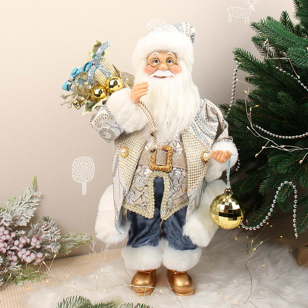 Дед Мороз одет в стильный голубой костюм с серебристыми вставками и узорами, украшенный жемчужными пуговицами и золотистым поясом, что придает образу торжественность и изящество. В руках у фигурки — мешок с подарками, украшенный золотистыми и синими деталями, и блестящий золотой шар, символизирующий праздничное настроение и радость предстоящих праздников.