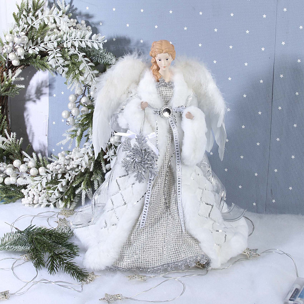 Ангел облачен в роскошную белую мантию с эффектными серебристыми вставками. Мягкий, пушистый мех добавляет тепло и уют. Эти элементы гармонично сочетаются с серебристой сеткой на платье, создавая впечатление воздушности. Особое внимание привлекают пушистые крылья, придающие фигуре легкость.