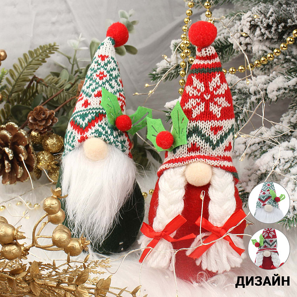 Украшение в виде гномов выполнено в ретро-стиле из текстильных материалов. Гном высотой 20 см украшен вязаной шапочкой с новогодним узором и красным помпоном на вершине, а также декоративными элементами в виде зеленых листиков с красными ягодами. Такое украшение подойдет для декора интерьера в новогодний сезон.