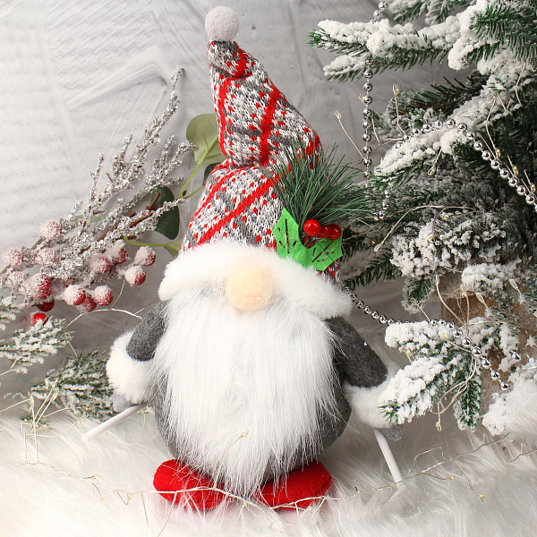 Декоративная фигурка гнома в ретро стиле — чудесное украшение для создания уютной атмосферы в зимнем интерьере. Высотой 33 см, гном выполнен из текстильных материалов с мягкой обивкой, дополненной вязаной шапкой в красно-серой гамме. Детали из искусственной хвои и красных ягод на шапке придают фигурке живописности и праздничного настроения. Небольшие деревянные лыжи подчёркивают тематику зимних забав и делают образ гнома особенно милым и выразительным.