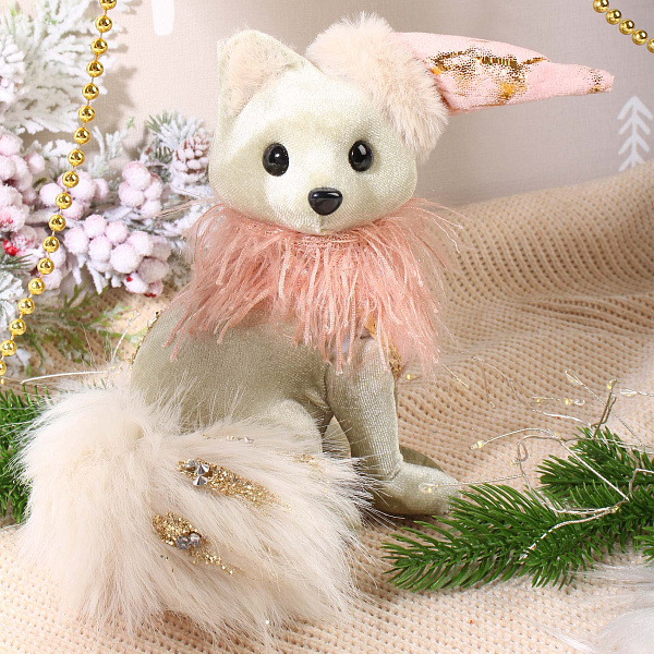 Декоративная фигурка лисы с праздничным колпаком выполнена в нежной розово-мятной цветовой гамме в винтажном стиле — изящное украшение для интерьера и праздничного декора. Изготовлена из мягкого велюра с бархатистой текстурой, дополнена пушистым меховым хвостом с золотистыми элементами и украшением из розовых перьев у шеи, что придает изделию утонченность и шарм. Высота фигурки составляет 17 см, обеспечивая удобство размещения на полках, каминных досках или в композициях.