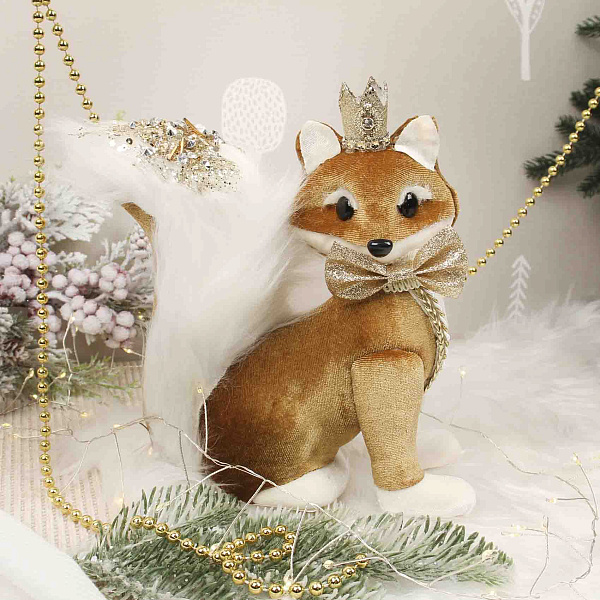 Декоративная фигурка лисы в винтажном стиле — элегантное украшение, которое станет изысканным акцентом в праздничном интерьере или стильным дополнением коллекции. Изготовлена из мягкого велюра золотистого оттенка с бархатистой текстурой, что придает изделию выразительность и ощущение тепла. Украшения в виде короны, блестящего банта и декорированного хвоста с использованием пайеток и страз создают атмосферу королевской роскоши и торжества.