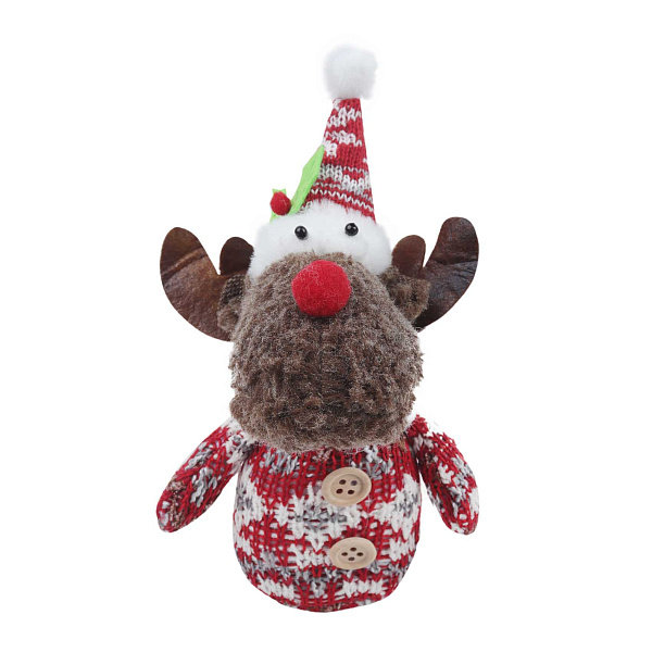 Украшение в виде лося выполнено в ретро-стиле из текстильных материалов. Высота изделия составляет 20 см. Лось одет в вязаную красно-белую шапку с помпоном и свитер с новогодним узором, что придает ему уютный и праздничный вид. Мягкая фактура и детали, такие как рога и красный нос, делают украшение оригинальным и привлекательным элементом новогоднего декора.