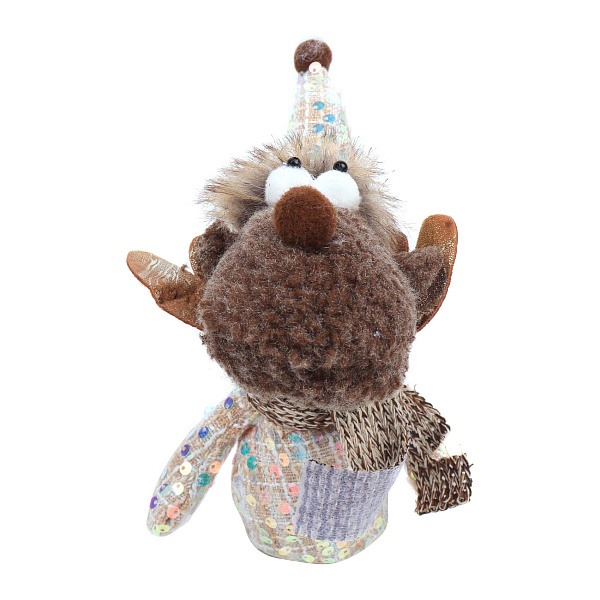 Новогоднее украшение в ретро-стиле в виде забавного лося высотой 20 см, выполненное из текстиля с мягкой и приятной на ощупь шерстяной поверхностью. Лось одет в блестящую пайеточную одежду золотисто-пастельных тонов и украшен уютным шарфом и колпаком с помпоном, что придает изделию винтажный и праздничный характер. Большие выразительные глаза и пушистый мех вокруг головы делают лося особенно милым и обаятельным. Это украшение станет стильным и теплым акцентом в новогоднем интерьере или елке.