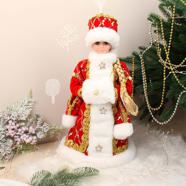 Декоративная фигура снегурочки высотой 40 см — изысканное и праздничное украшение для новогоднего интерьера. Фигурка выполнена из качественного пластика и одета в роскошный красный бархатный наряд с декоративной отделкой золотистыми лентами и пайетками, дополненный мягким белым искусственным мехом.