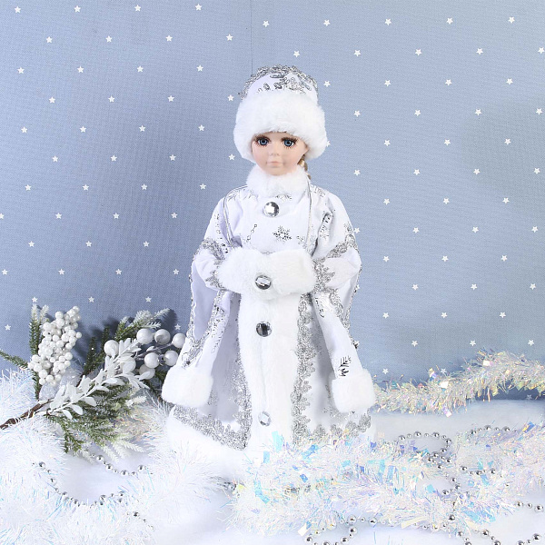 Шуба Снегурочки украшена пуговицами-стразами и отделана белым мехом, а головной убор дополняет образ настоящей зимней сказки. Лицо Снегурочки проработано с особой аккуратностью, придающей ей выражение нежности и доброты.