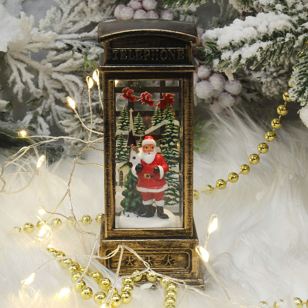 Декоративный элемент в виде телефонной будки с подсветкой выполнен из пластика с эффектом старения, что придает изделию винтажный и уютный вид. Внутри будки размещена фигурка санта-клауса с подарками и новогодними деревьями, создавая праздничную атмосферу. Высота украшения составляет 15 см, что делает его заметным и оригинальным украшением интерьера в преддверии праздников.