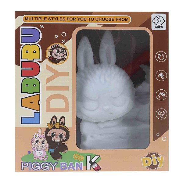 Набор для росписи «Копилка в форме Лабубу» содержит готовую основу. Копилка имеет белый цвет и оригинальную форму. В комплект входят шесть цветов красок, две кисти и пластиковая палитра. Гладкая поверхность удобна для нанесения рисунка. Этот набор помогает развивать творческие навыки и мелкую моторику. Ребенок создает индивидуальный дизайн фигурки. Готовое изделие служит для хранения сбережений.
