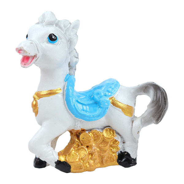 Новогодняя фигурка в виде забавной лошадки, украшенной ярким голубым седлом и золотыми деталями, станет отличным праздничным украшением интерьера или сувениром. Компактный размер высотой 5 см и выразительная поза создают настроение новогоднего торжества.