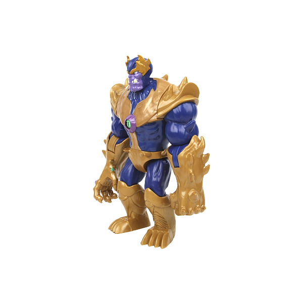 Высота героя – 24 см. У него большие руки, на одной из них надета перчатка с камнями бесконечности. Сзади есть специальный механизм, помогающий размахнуться рукой в перчатке, чтобы быстро схватить врага. Упакован в яркую картонную коробку. Такую игрушку можно смело дарить на любой праздник.