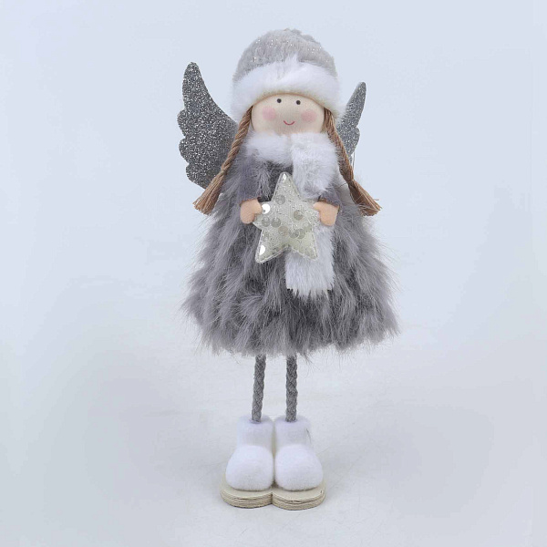 Новогодняя фигурка Ангела имеет высоту 25 сантиметров. Наряд выполнен из пушистого текстиля белого и серого цвета. Крылья и одежда создают объемный силуэт. Внутренний каркас содержит проволоку. Это позволяет изменять положение рук и крыльев. Фигурка становится элементом праздничного декора.