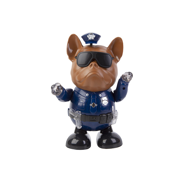 Бульдог в форме защитника правопорядка умеет танцевать. Забавная интерактивная игрушка будет одобрена детьми и взрослыми. Она привлекает внимание оригинальным внешним видом и набором функций в виде световых и звуковых эффектов. У игрушки светятся кончики передних лап, что позволяет детям весело провести время при выключенном свете. Изделие предназначена для мальчиков и девочек с трех до семи лет, изготовлено из прочного пластика. Такой материал не представляет опасности для детского организма. Сами манипуляции с изделием дарят хорошее настроение, активируют фантазию и моторику рук. Питание производится от батареек. Не рекомендуется использовать детям младше 3 лет.
