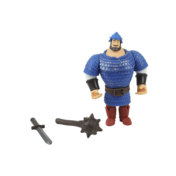 Игрушка точно копирует облик мультипликационного героя, у него синяя кольчуга, синий шлем, красные сапоги, черные наручи. Вооружение Ильи Муромца составляют палица и меч. Их можно вкладывать в руки богатыря, как по отдельности, так и в каждую руку. Ноги и руки на шарнирах, их можно сгибать, придавая богатырю разные позы.