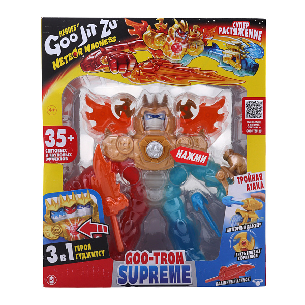 Фигурка-тянучка Гуджитсу Ту-Трон Метеор Мэднесс представляет собой яркого и эффектного персонажа серии GooJitZu, выполненного из эластичного материала, который позволяет растягивать игрушку до 80 см без повреждений. Фигурка сочетает в себе три героя в одном, оснащена различными игровыми элементами, такими как метеорный бластер, вихрь теневых сорижек и пламенный клинок, что добавляет разнообразия и динамики игровому процессу.