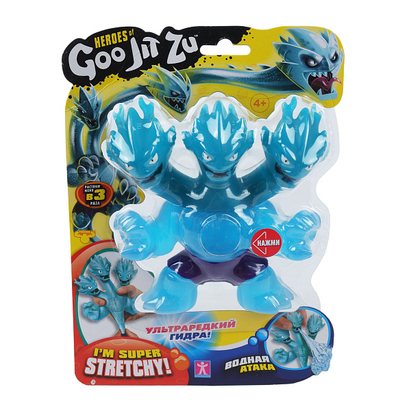 Фигурка-тянучка «Гуджитсу: Ультраредкий Гидра Водная Атака» — это мягкая, эластичная игрушка из серии «Heroes of Goo Jit Zu», выполненная в виде трехголового монстра сине-голубого цвета. Игрушка изготовлена из специального материала, который позволяет растягивать, сжимать и скручивать ее без повреждений, сохраняя форму после каждого использования.