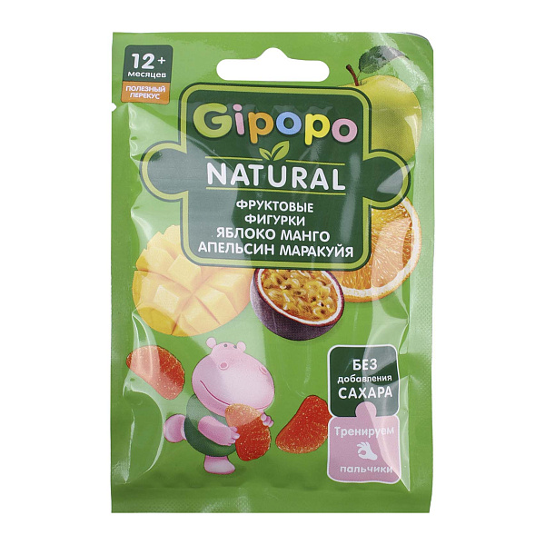 Фруктовые фигурки Gipopo — это натуральный перекус для детей от 1 года. В упаковке представлены фигурки из яблока, манго, апельсина и маракуйи. Каждая фигурка — это маленький витаминный заряд, придающий сил и энергии.