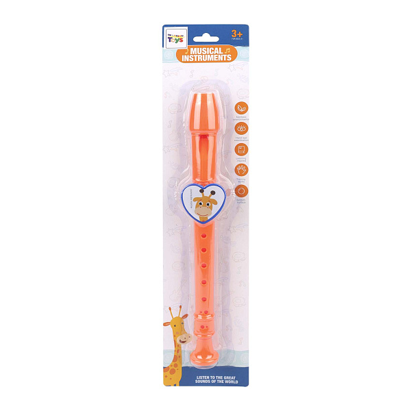 Флейта «Веселые звери» длиной 30 см выполнена из прочного пластика ярко-оранжевого цвета. На верхней части флейты — милое изображение жирафа, что привлекательно для детей и добавляет инструменту игривый вид. Инструмент легкий, с гладкой поверхностью и удобными отверстиями для пальцев, что позволяет детям легко научиться играть первые мелодии.