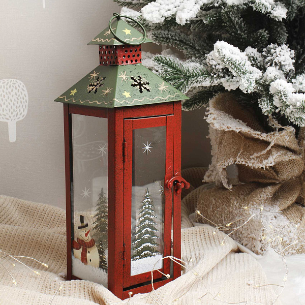 Декор-фонарь высокий в ретро-стиле — новогоднее украшение из металла высотой 28 см. Изделие выполнено в классических праздничных цветах: корпус красного цвета, крыша зеленая, украшена снежинками и звездочками. Стеклянные стенки украшены зимними сюжетами с изображением елок и снеговика, создавая атмосферу уюта и праздника. Фонарь оснащен дверцей с замком для размещения свечи или светодиода внутри. Идеально подходит для оформления интерьера, создания теплой рождественской атмосферы.
