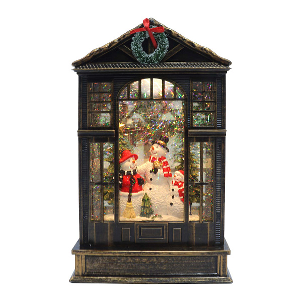 Фонарь декоративный Снеговики с подсветкой и эффектом падающего снега 25см