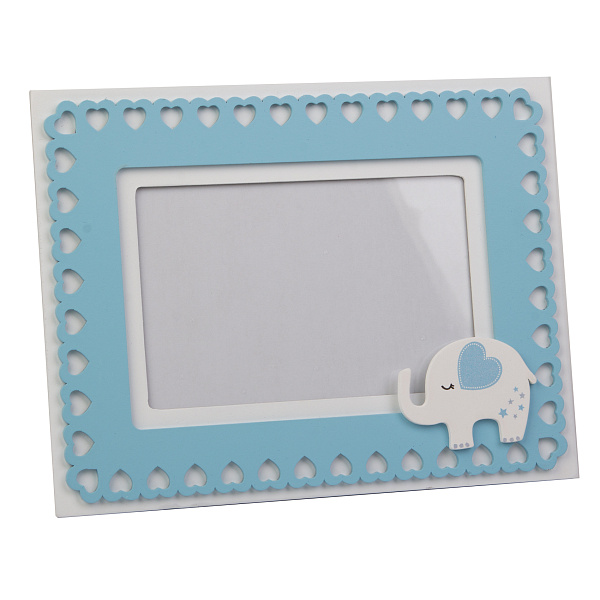 Рамка изготовлена из плотного устойчивого материала, сзади оснащена крючками для фиксации фотографии. Подставка выполнена в виде ножки и оснащена поворотным механизмом, с помощью которого рамку можно повернуть в любом направлении. При этом на рамке в углу присутствует резной элемент в виде забавного слоника, поэтому рамка подойдет для детского снимка.