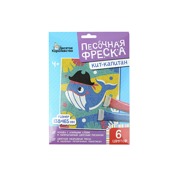 Кит-капитан бороздит моря и ждет, когда маленький помощник соберет с ним красочную песочную фреску! Основа с клеящим слоем и напечатанным цветным рисунком упростит задачу, а расфасованный по пакетикам цветной кварцевый песок сделает процесс творчества удобнее. В упаковке ребенок найдет 6 пакетиков с разноцветным песком, а также картон и бумагу. На оборотной стороне коробки изображена пошаговая инструкция, которая в сопровождении с иллюстрациями поможет ребенку легко и с удовольствием сотворить картину с морским жителем. Набор развивает моторику рук, воображение и умение работать с мелкими деталями. Рекомендовано для детей с 4 лет. Размер панно 138х165мм.