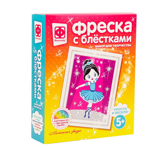 При помощи набора ребенок может самостоятельно или вместе с родителями украсить блёстками фреску с изображением очаровательной балерины.